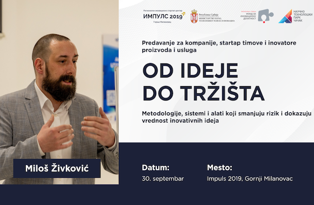 Regionalni inovacioni startap centar Impuls 2019 organizuje predavanje „Od ideje do tržišta: Mapiranje puta tvog budućeg startapa“ u Gornjem Milanovcu. Cilj događaja je da mikro, malim i srednjim preduzećima, kao i startap timovima iz regiona, omogući pristup globalnim validacionim alatima i matricama koje koriste najuspešnije kompanije širom sveta.
