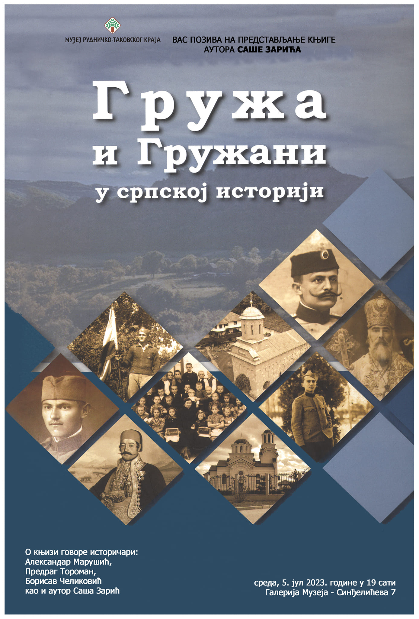 Muzej rudničko-takovskog kraja, sinoć je predstavio knjigu „Gruža i Gružani u srpskoj istoriji“ Saše Zarića. O knjizi su govorili istoričari Borisav Čeliković, Predrag Toroman, Aleksandar Marušić, kao i autor izdanja.