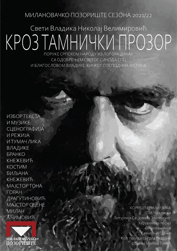 Uz odobrenje Svetog sinoda SPC i blagoslov Vladike žičkog gospodina Justina u četvrtak, 14. oktobra 2021. godine od 20 sati u velikoj sali Kulturnog centra premijerno će biti izvedena monodrama: “Kroz tamnički prozor – Poruke srpskom narodu iz logora Dahau”.