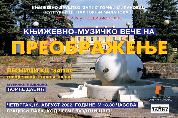 Književno društvo „Zapis“ i Kulturni centar u četvrtak, 18. avgusta 2022. godine organizuju u Gradskom parku, kod česme „Vodeni cvet“ književno – muzičko veče na Preobraženje.