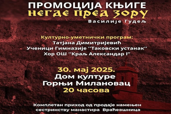 U petak, 30. maja, s početkom u 20 časova, u holu Doma kulture u Gornjem Milanovcu biće održana promocija zbirke pesama „Negde pred zoru“, autora Vasilija Gudelja.