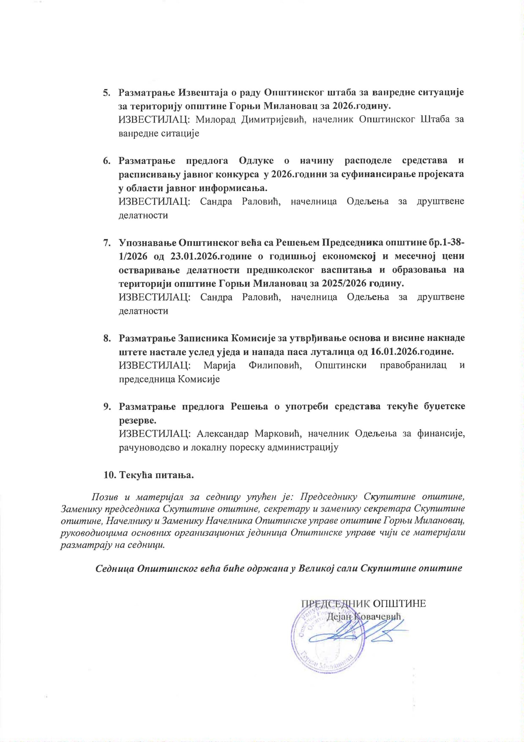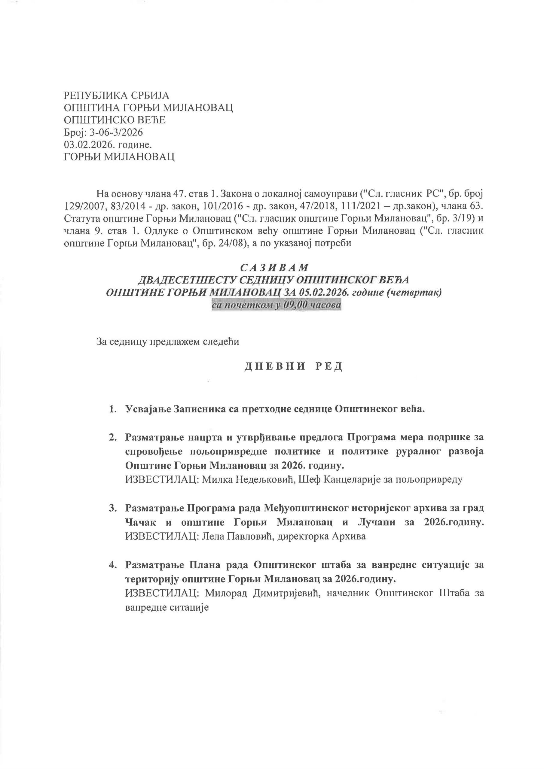 GORNJI MILANOVAC – Za četvrtak, 5. februar 2026. godine, sazvana je 26. sednica Opštinskog veća opštine Gornji Milanovac. Zasedanje će biti održano u Velikoj sali Skupštine opštine sa početkom u 09:00 časova.