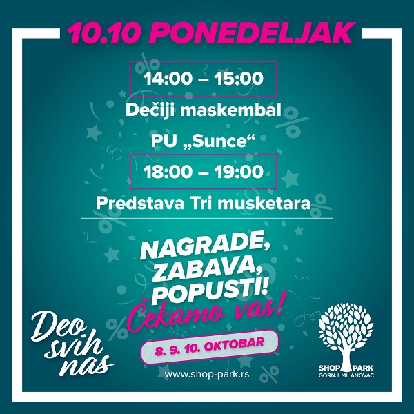 „Mi volimo da slavimo! Kada kažem mi, mislim i na Shop Park i na naše Milanovčane. Vreme slavlja je nekako, uvek ispunjeno osmesima. I nije nam teško da nađemo razlog za to, u svakom danu, u malim i velikim stvarima koje nas okružuju, u datumima, sećanjima, raznim posvetama. Mesec oktobar donosi jesenje boje sa sobom – pune džepove zlata. Kažu da je on jedna velika žurka. I sve nekako ima smisla.