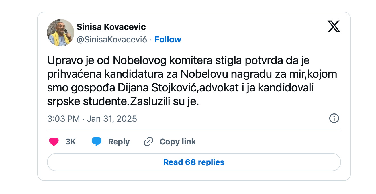 Studenti iz Srbije zvanično su kandidati za Nobelovu nagradu za mir, napisao je pisac i dramaturg Siniša Kovačević na društvenoj mreži X.
