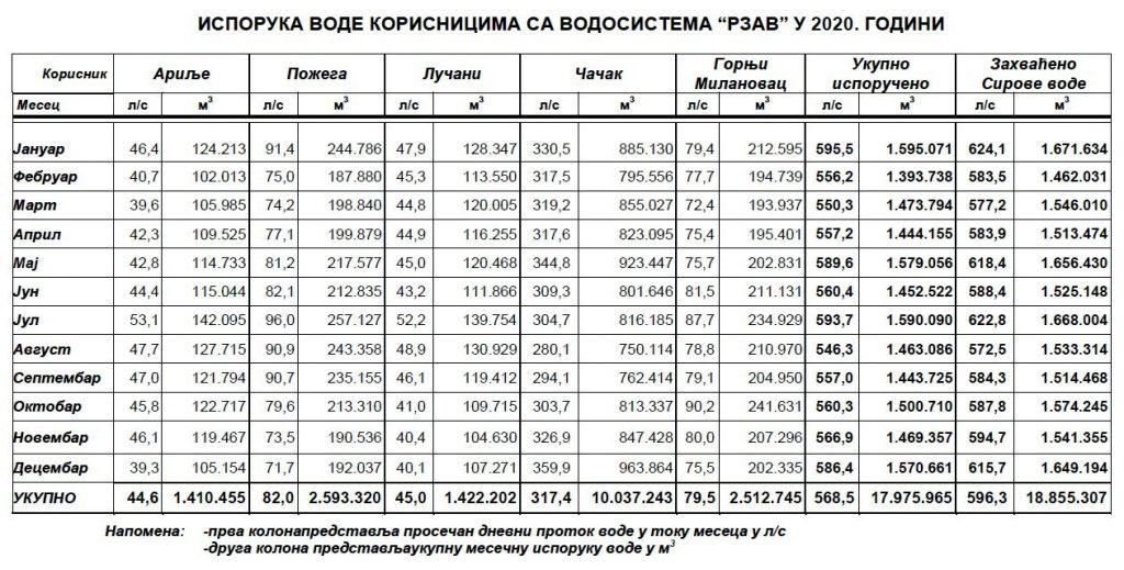 Prema pregledu isporuka vode sa „Rzava“ ka korisnicima osnivačima u prethodnih 10 godina, grad (Čačak) i 4 opštine, dobijali su po potraživanjima ukupno između 16 i 18 miliona metara kubnih (m3 ) pijaće vode godišnje. Milanovac je za isti period dobijao količine prema popisu u tabeli: