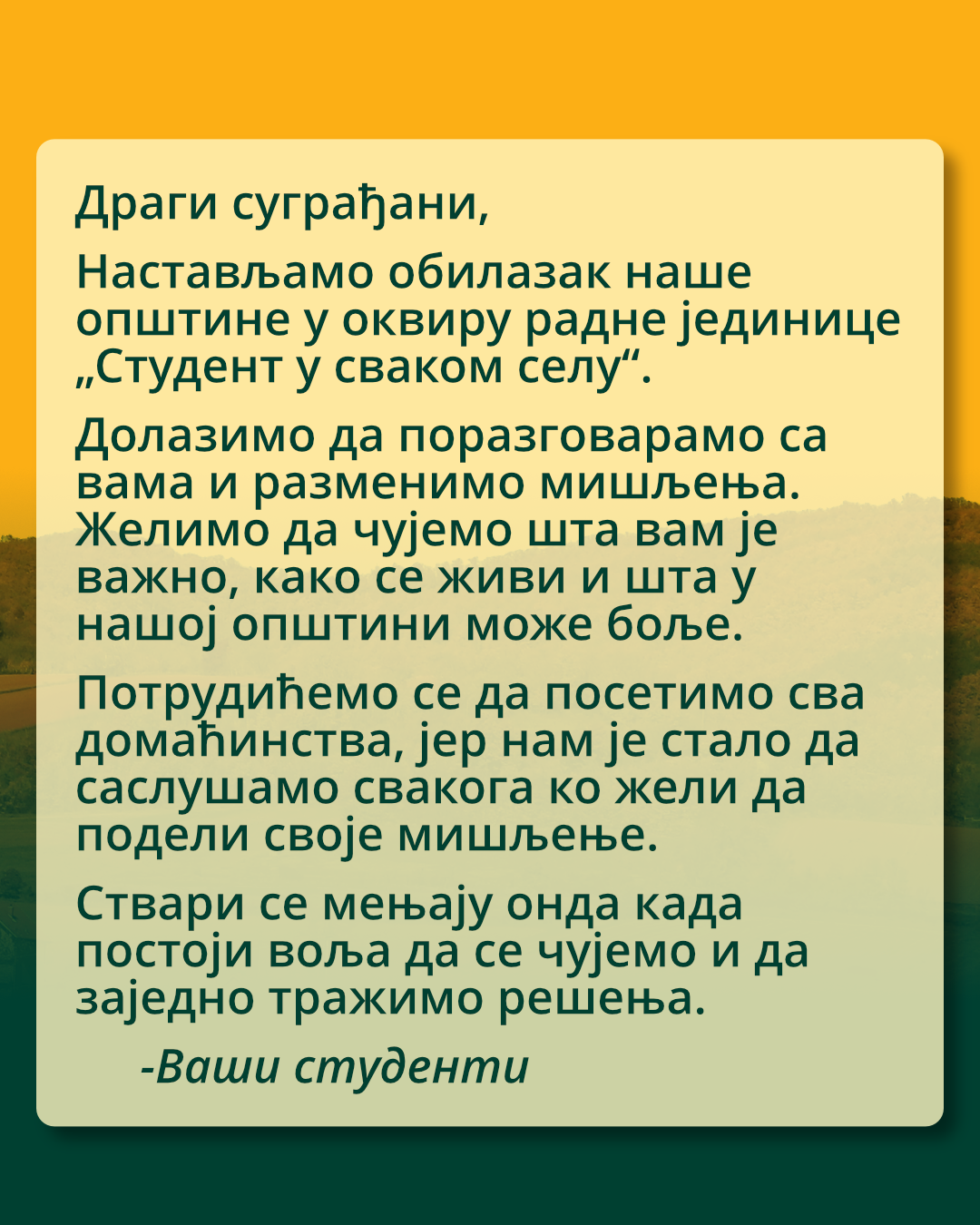 Studenti Gornjeg Milanovca najavili su nastavak akcije obilaska meštana u okviru radne jedinice „Student u svakom selu“, koja će u petak, 13. marta, obuhvatiti Gornju Crnuću, Donju Crnuću i Vraćevšnicu.