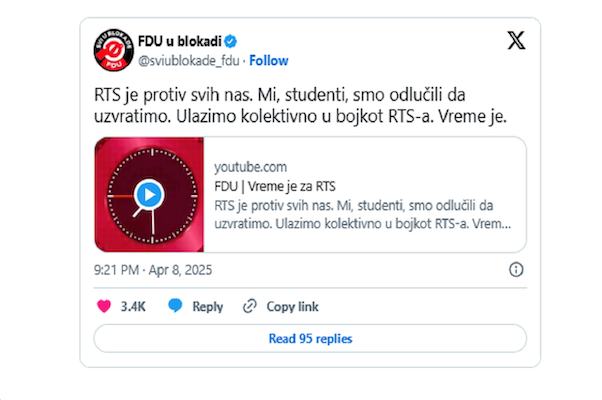 Studenti FDU navode i da sve počinje tako što neko plati račun, da bi se zatim izgradio udoban studio da bi novinari RTS-a mogli da „rade svoj posao – lažu“. Oni ističu da za „laganje RTS-a godišnje plaćamo 120 miliona evra“, te da javni servis, uprkos sopstvenim tvrdnjama, ne vodi dijalog, prenosi Nova.rs.