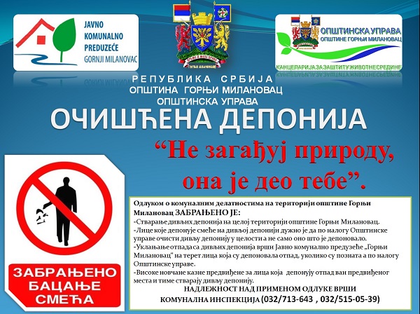 – U oblasti upravljanja otpadom se svakodnevno odvozi smeće sa seoskog područja cele naše opštine i po tome smo jedinstveni u našoj državi. Pored toga se svake godine čiste nelegalna odlagališta otpada i postavljaju informativne i edukativne table, sve u saradnji sa JKP “Gornji Milanovac“ – ističu iz kabineta.