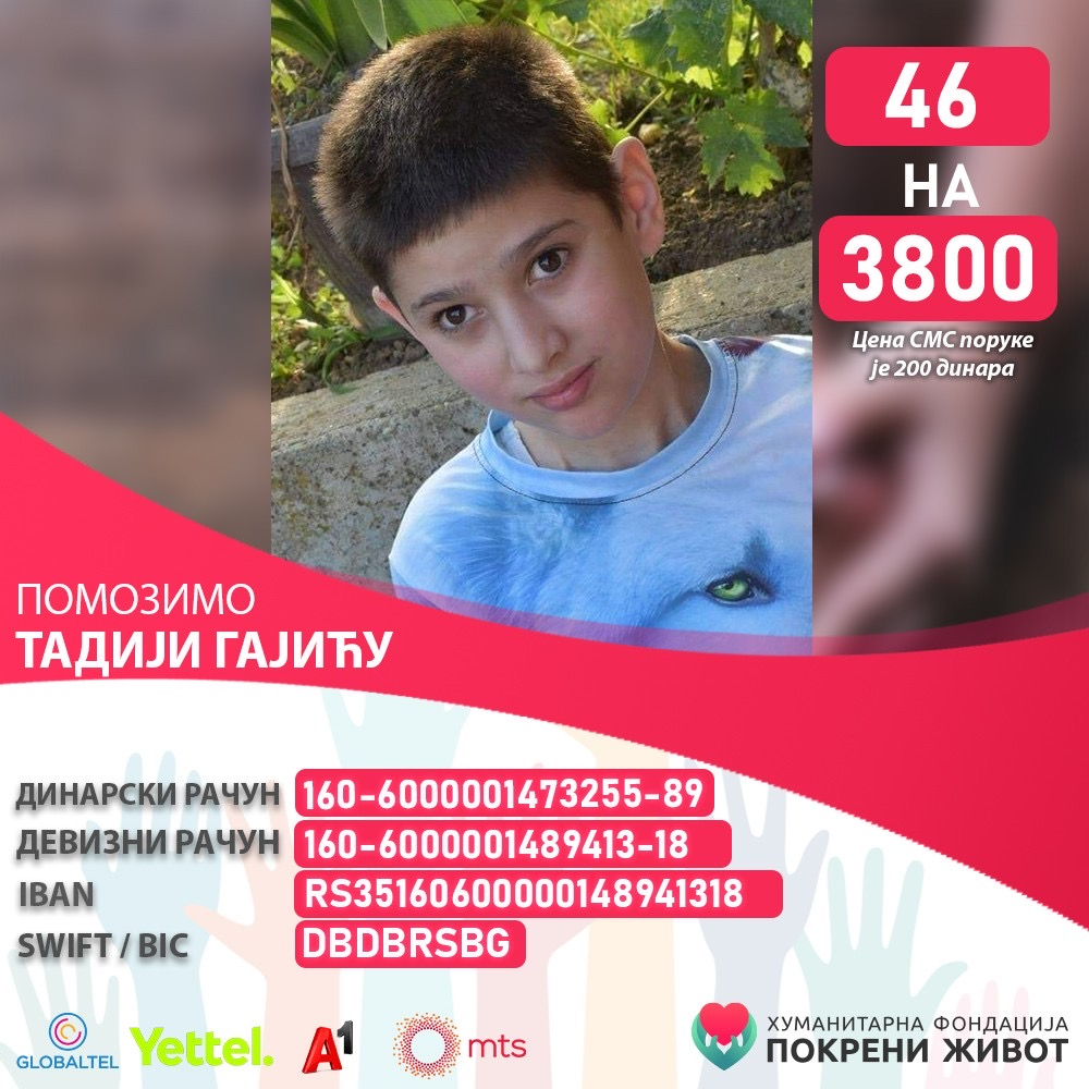 Humanitarna fondacija „Pokreni život“ pokrenula je akciju prikupljanja novčanih sredstava za lečenje Tadije Gajića, dečaka rođenog sa teškim zdravstvenim problemom — rascepom kičme (Spina bifida).
