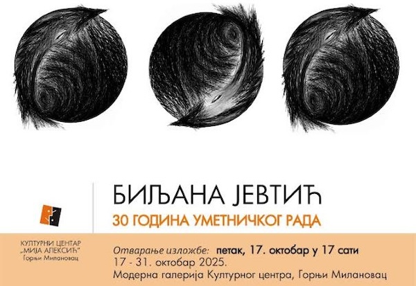 Biljana Jevtić, redovna profesorka na Akademije umetnosti Univerziteta u Novom Sadu (Katedra za Crtanje), povodom 30 godina umetničkog rada, u petak 17. oktobra 2025. godine u Modernoj galeriji Kulturnog centra predstaviće svoje stvaralaštvo. Otvaranje izložbe je 17 sati.