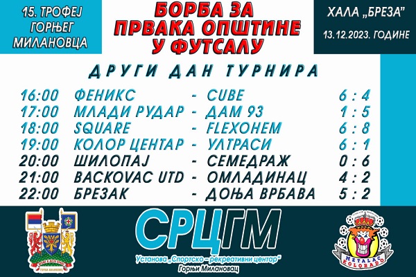 Drugog dana Trofeja Gornjeg Milanovca 2023 pod nazivom „Borba za prvaka opštine u futsalu“, koji se od 12. decembra 2023. godine održava u sportskoj hali „Breza“ pod pokroviteljstvom Opštine Gornji Milanovac, a u organizaciji Ustanove „Sportsko – rekreativni centar“ Gornji Milanovac i Futsal kluba „Metalac Kolorado“, odigrano je 7 utakmica – 4 u juniorskoj i 3 u seniorskoj konkurenciji.