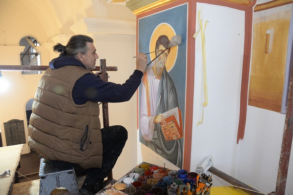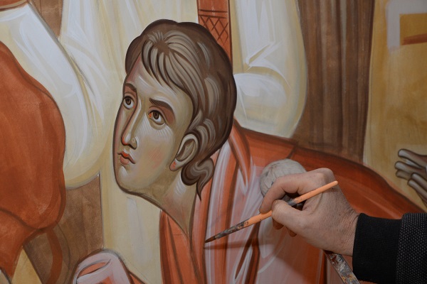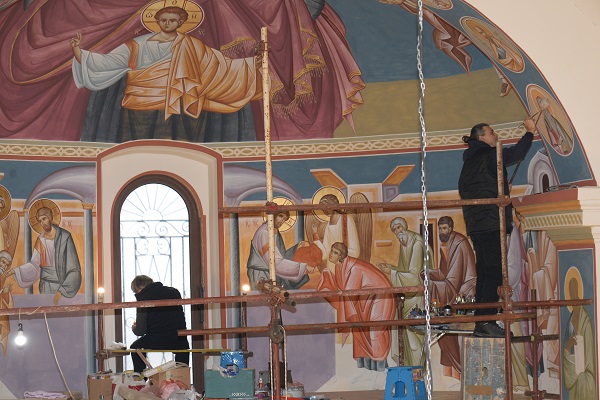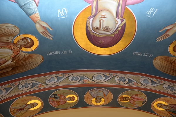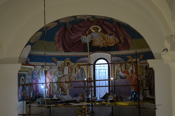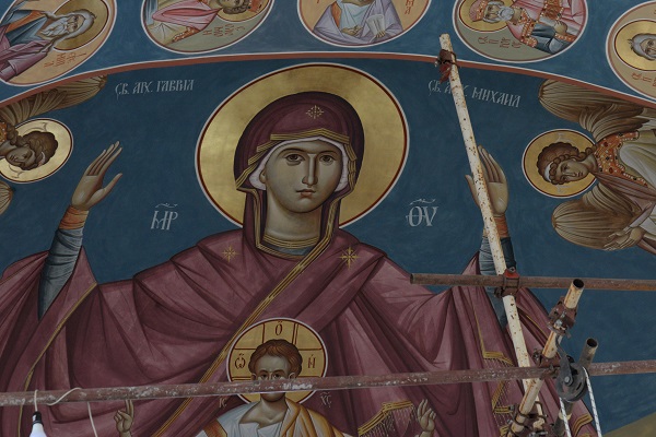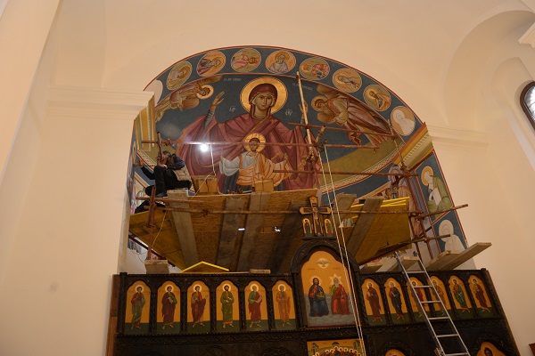 Iznad oltara, duhovno i slikovno kao kompozicija, gleda nas Bogorodica Širša, ŠIRA OD NEBESA. Oko nas biće tajna večera, scena pričešćivanja apostola, 12 dopojasnih arhijereja, srednjevekovni arhiepiskopi i patrijarsi, kompozicija sveštenomučenika episkopa 20. veka, cele figure arhijereja liturgičara, u avoj veličini prirodnoj, figura Svetoga Save i Svetog Nikolaja Miriklijskog, a ma četiri stuba i Evanđelisti dopojasni.