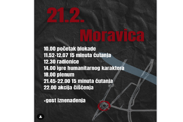 Studenti u blokadi Fakulteta tehničkih nauka i maturanti Gimnazije u Čačku pozivaju sugrađane da im se pridruže u zajedničkoj akciji 12-časovne blokade kružnog toka kod Moravice u petak, 21. februara 2025. godine.