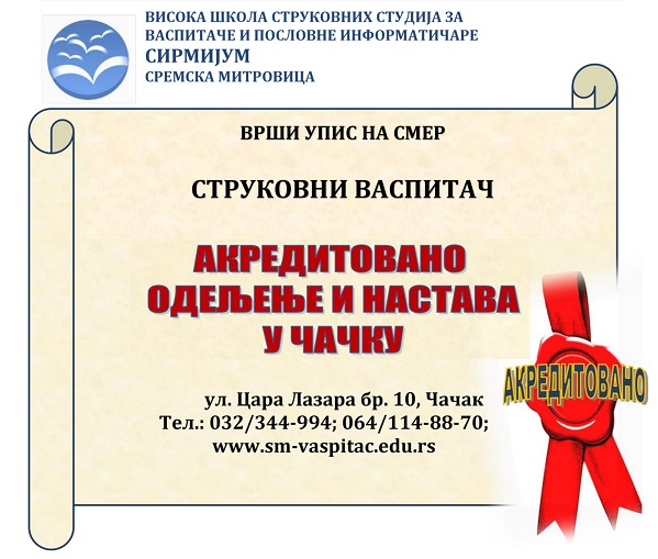 Visoka škola strukovnih studija za obrazovanje vaspitača iz Sremske Mitrovice, akreditovano odeljenje Čačak, Ulica cara Lazara broj 10, Informacije o upisu na telefone 032-344-994 i 064-114-88-70