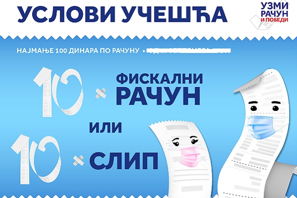U nagradnoj igri, koju organizuje Vlada Republike Srbije, a podršku pruža NALED-a, pravo učešća imaju građani koji pošalju koverte sa 10 fiskalnih računa ili 10 slipova, ne starijih od 1. aprila 2021. sa minimalnim pojedinačnim iznosom od 100 dinara.