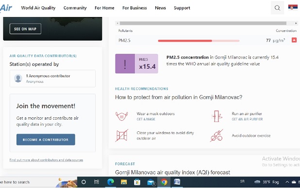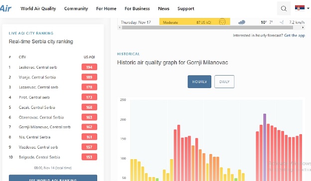 Prema podacima sa sajta IQAir, vazduh je danas zagađen u velikom broju gradova Srbije, ali veliki procenat zagađenja je i u Gornjem Milanovcu.