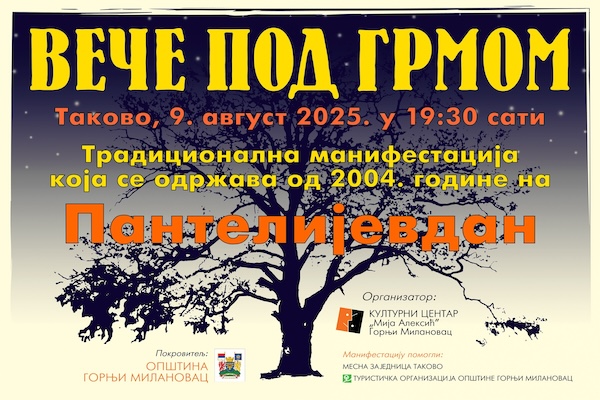Tradicionalna smotra narodnog stvaralaštva „Veče pod grmom“, biće organizovana u subotu, 9. avgusta 2025. godine u Takovu, na platou ispred Takovskog grma, mesta gde je 1815. godine knez Miloš Obrenović podigao Drugi srpski ustanak.