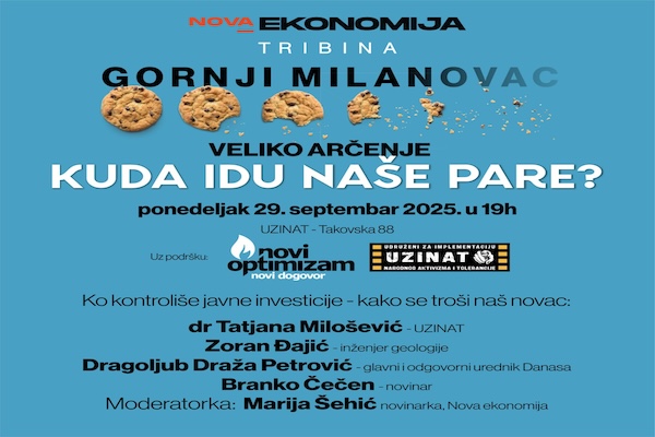 Tema tribine je „Ko kontroliše javne investicije – kako se troši naš novac“, a govornici će biti Branko Čečen, novinar, Dragoljub Draža Petrović, glavni i odgovorni urednik Danasa, Zoran Đajić, inženjer geologije i dr Tatjana Milošević, UZINAT. Modetorka je Marija Šehić, novinarka Nove ekonomije