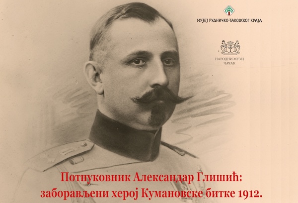 Predavanje „Potpukovnik Aleksandar Glišić: zaboravljeni heroj Kumanovske bitke 1912. godine“, biće održano, u utorak 12. marta 2024. godine, u 19 sati, u galeriji Muzeja rudničko-takovskog kraja.
