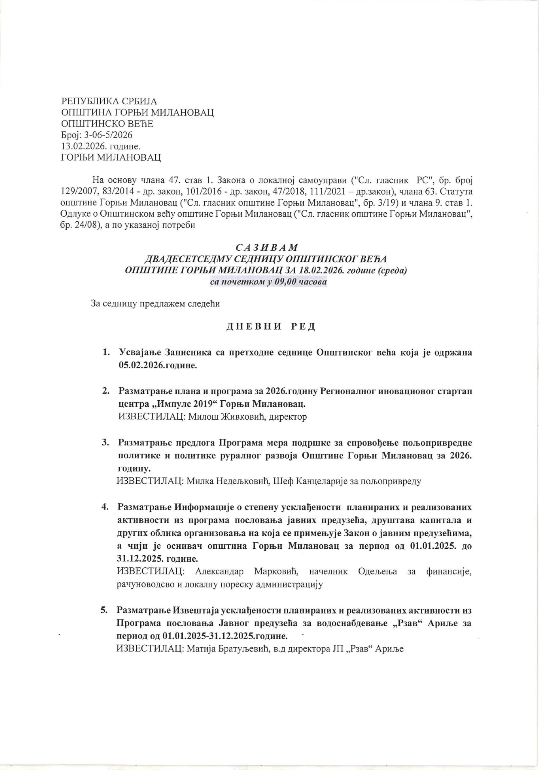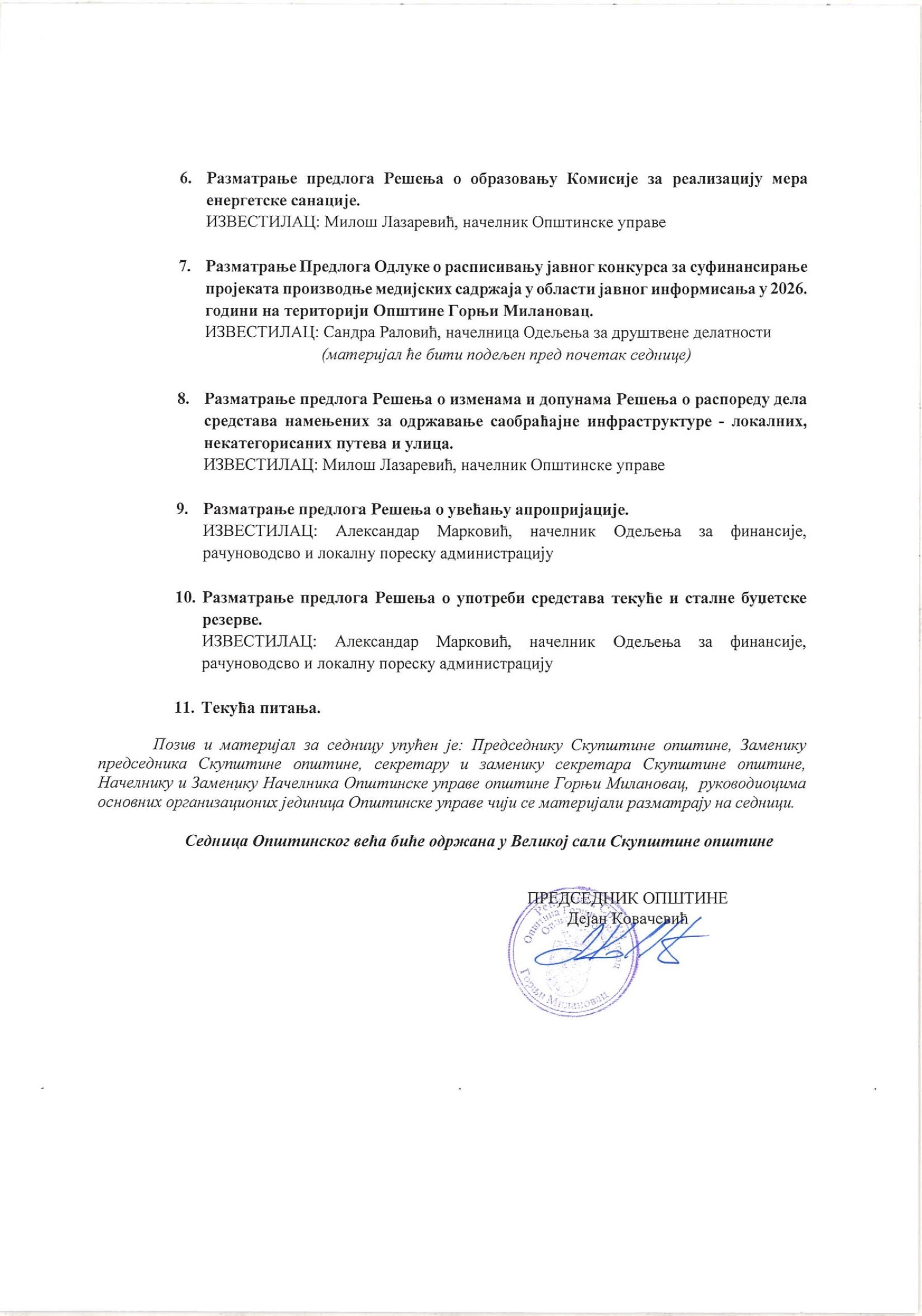 Na dnevnom redu je i Predlog odluke o raspisivanju javnog konkursa za sufinansiranje projekata proizvodnje medijskih sadržaja u oblasti javnog informisanja u 2026. godini na teritoriji opštine Gornji Milanovac.