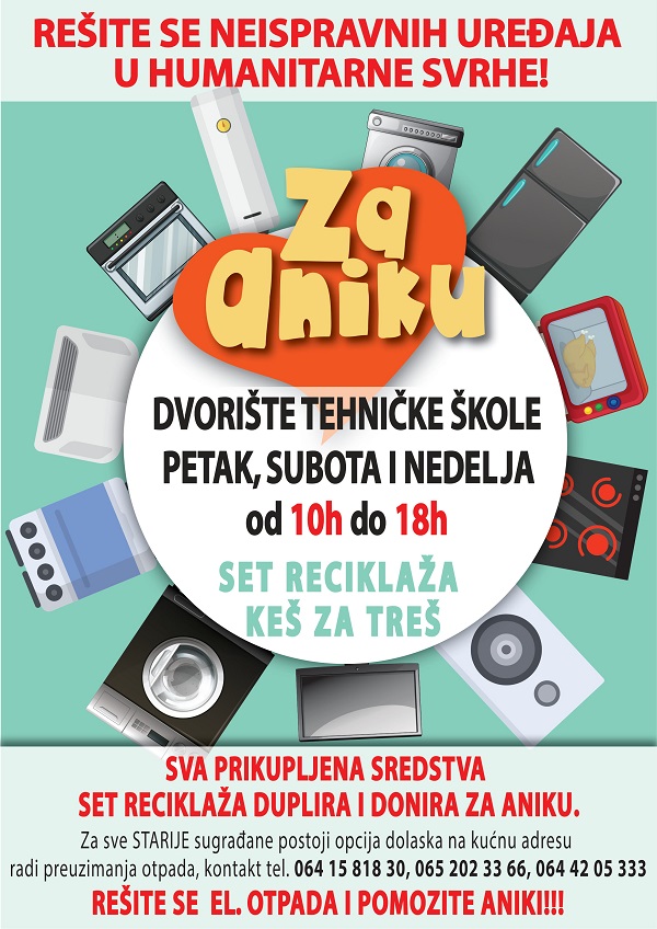 Donesite stare uređaje kao što su monitori, kućišta, šporeti, klime, tv, frižideri, veš mašine, zamrzivači… u dvorište Tehničke škole 16, 17. i 18. oktobra, od 10 do 18 sati, oslobodite se otpada na ekološki ispravan način. Na ovaj način doprinosite zaštiti životne sredine i, još važnije, borbi za Anikin dug i lep život!